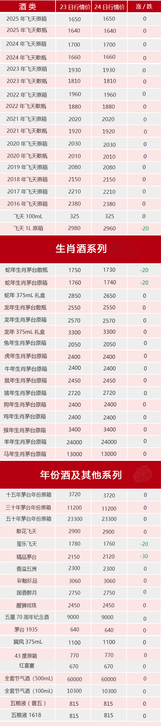 上周,飛天略有下跌,原箱從1680元跌至1650元,散瓶從1660元跌至1640元。而其他茅臺(tái)酒有兩款產(chǎn)品跌幅比較大。蛇茅上周一直在跌,原箱從1800元跌至1740元,目前沒有止跌的跡象。精品茅臺(tái)則從2170元跌至2120元。近幾個(gè)月以來,飛天是有漲有跌,總體下行,那么蛇茅和精品這些茅臺(tái)酒都是長(zhǎng)期陰跌,偶爾穩(wěn)定。(圖文:不二醬)
