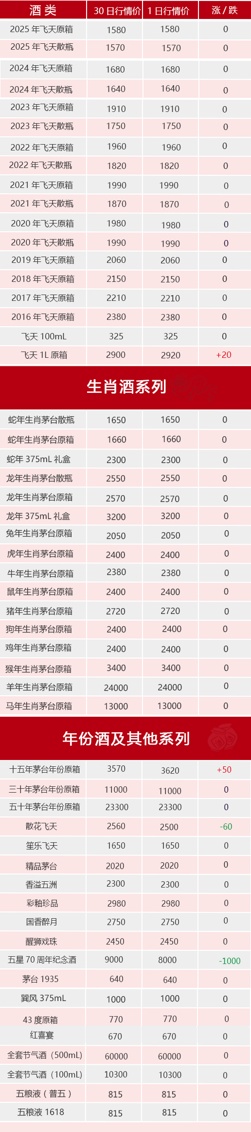 飛天原箱從1650元跌至1580元,散瓶從1640跌至1570元;公斤飛天從2960元跌至2920元;蛇茅和精品茅臺則跌幅更大,前者從1740元跌至1660元,后者從2120元跌至2020元。除此之外,次新飛天也基本上跌至2000元以下了。(圖文:不二醬)