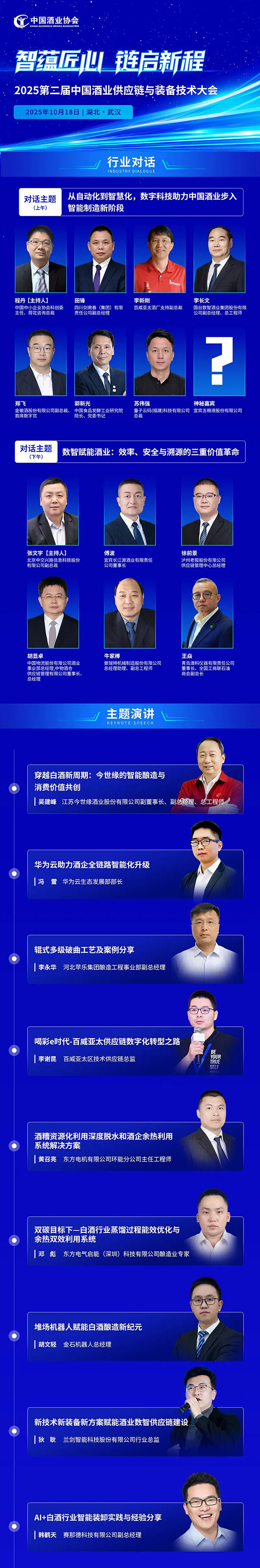 2025年10月18日,2025第二屆中國酒業(yè)供應(yīng)鏈與裝備技術(shù)大會即將于湖北省武漢市正式召開,屆時國內(nèi)近百家酒企總工、數(shù)字化負責(zé)人、裝備負責(zé)人、供應(yīng)鏈負責(zé)人以及國內(nèi)一 流裝備企業(yè)、供應(yīng)鏈企業(yè)將共聚一堂。大家將拋開空泛的理論,直擊痛點,共同探討如何利用實實在在的數(shù)字化技術(shù)與智能化裝備:讓釀酒更高 效、讓品質(zhì)更穩(wěn)定、讓發(fā)展更環(huán)保、讓營銷更精準、讓倉儲更智能、讓物流更敏捷;將數(shù)據(jù)真正轉(zhuǎn)化為生產(chǎn)力,讓傳統(tǒng)工藝與前沿科技真正實現(xiàn)融合。