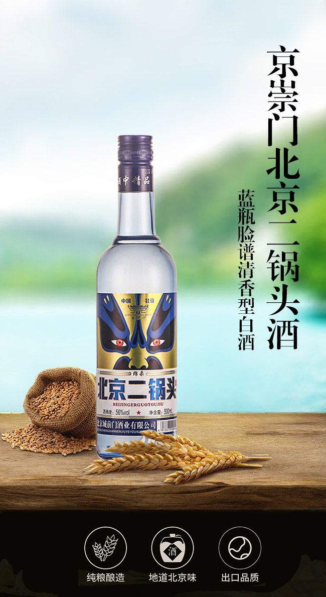 產(chǎn)品名:京崇門(mén)北京二鍋頭酒藍(lán)瓶臉譜清香型白酒【42°56°500ml】