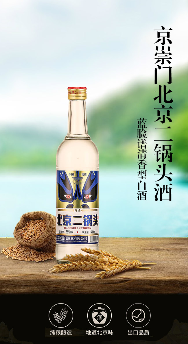 產品名:京崇門北京二鍋頭酒藍臉譜清香型白酒【42°56°500ml】