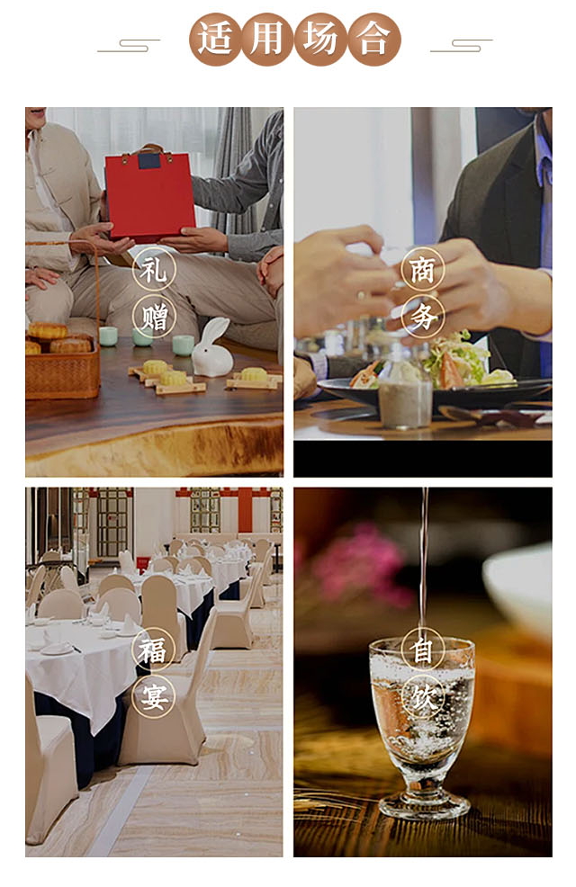 適飲場合:商務(wù)宴會、團(tuán)圓小酌、婚慶宴席、節(jié)日送禮、收藏