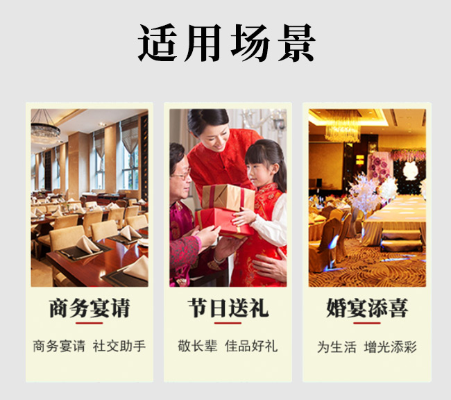 適飲場(chǎng)合:商務(wù)宴會(huì)、團(tuán)圓小酌、婚慶宴席、節(jié)日送禮、收藏等