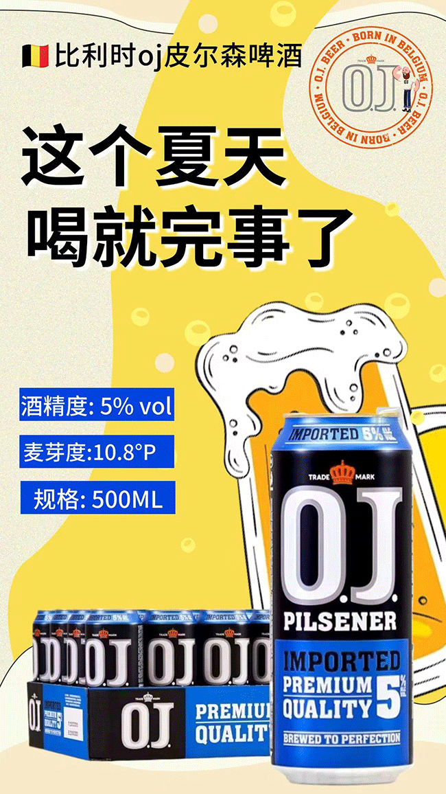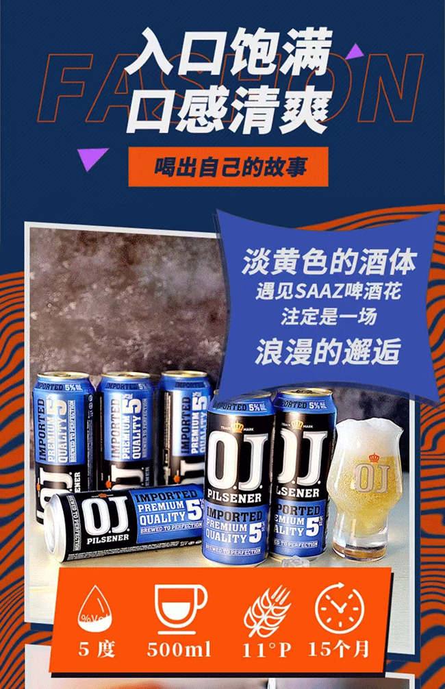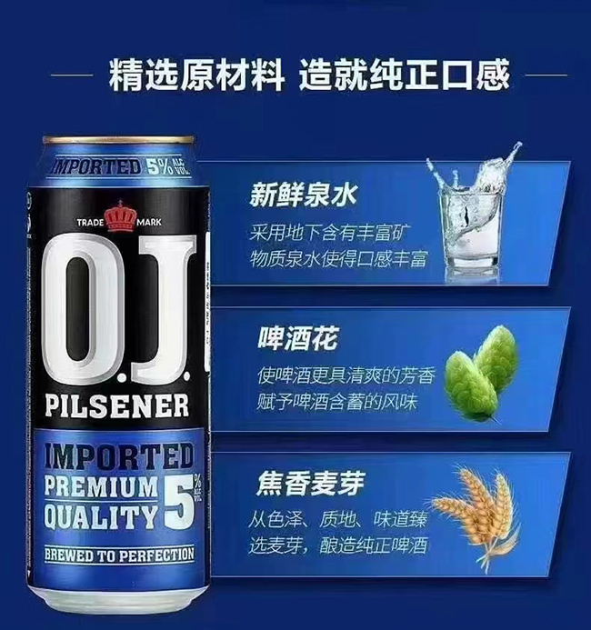 O. J. 5 度啤酒是一款口味清爽的皮爾森啤酒,采用的是純釀法,不添加玉米、大米等便宜且出汁率高的原料,只使用正宗優(yōu)質(zhì)小麥芽、酵母、SAAZ 啤酒花和水來釀造啤酒,以保持啤酒的純凈。