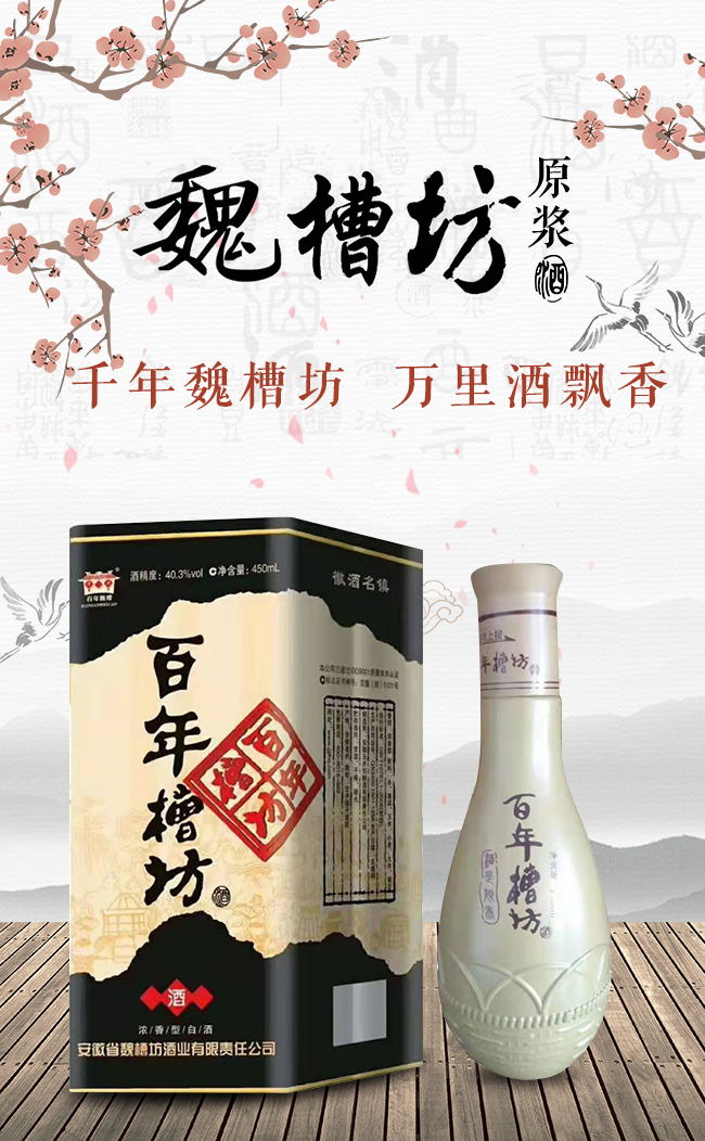 安徽魏槽坊酒業(yè)有限責(zé)任公司座落在華夏酒城安徽白酒之鄉(xiāng)——亳州市古井鎮(zhèn)。地處大京九鐵路沿線,自古以來(lái),人杰地靈、物華天寶、資源豐富。公司釀造的白酒是通過(guò)“擇層取醅”、“擇時(shí)摘酒”等傳統(tǒng)技術(shù),得到精華的原漿美酒,再放入地下酒庫(kù)經(jīng)陶壇洞藏一定年限,使其自然老熟。