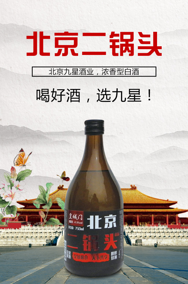 北京九星酒業(yè)有限公司是一家集產(chǎn)品研發(fā),生產(chǎn)銷售為一體的現(xiàn)代化白酒規(guī)模企業(yè)。目前開發(fā)的主要是皇城門系列白酒產(chǎn)品。是以優(yōu)質(zhì)高粱為主要原料,用大麥、小麥、豌豆制成大曲,輔多種微生物為糖化酵劑,再經(jīng)過長期發(fā)酵,緩慢蒸餾,取之精華,經(jīng)多年陳貯后,精心勾兌而成。以“清香幽雅,醇厚綿甜,尾昧爽凈”的獨特風格,深受各界朋友的青睞。