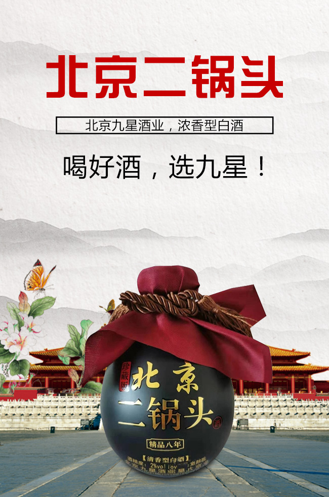 北京九星酒業(yè)有限公司是一家集產(chǎn)品研發(fā),生產(chǎn)銷售為一體的現(xiàn)代化白酒規(guī)模企業(yè)。目前開發(fā)的主要是皇城門系列白酒產(chǎn)品。是以優(yōu)質(zhì)高粱為主要原料,用大麥、小麥、豌豆制成大曲,輔多種微生物為糖化酵劑,再經(jīng)過長期發(fā)酵,緩慢蒸餾,取之精華,經(jīng)多年陳貯后,精心勾兌而成。以“清香幽雅,醇厚綿甜,尾昧爽凈”的獨(dú)特風(fēng)格,深受各界朋友的青睞。