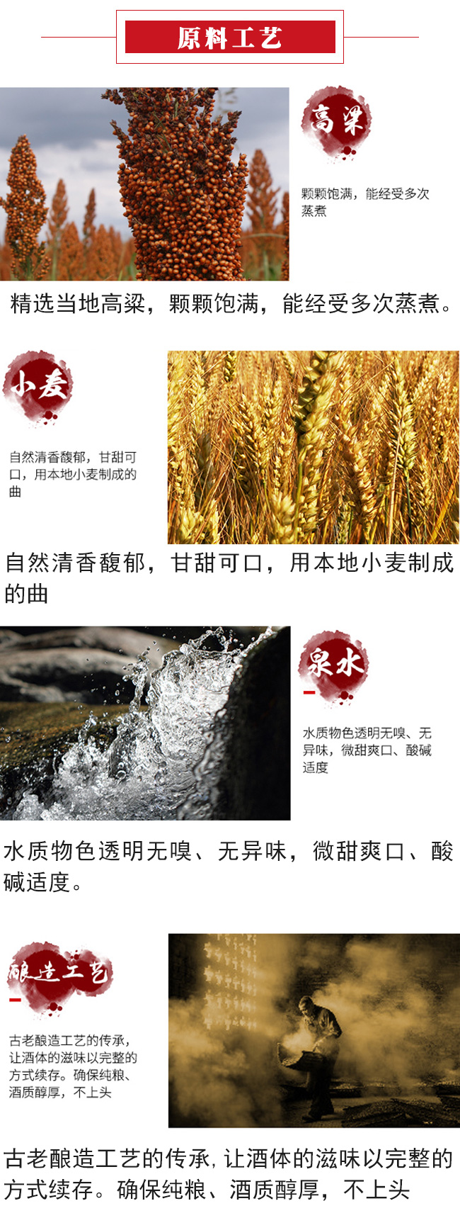 原料:高粱,大米、玉米、小麥、糯米、豌豆等
