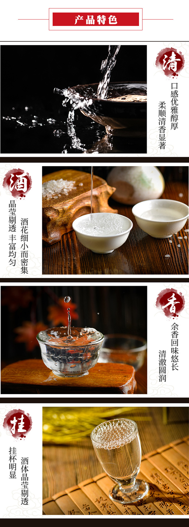 口感:具有芳香濃郁、綿柔甘洌、香味協(xié)調(diào)、入口甜、落口綿、尾凈余長等特點(diǎn)