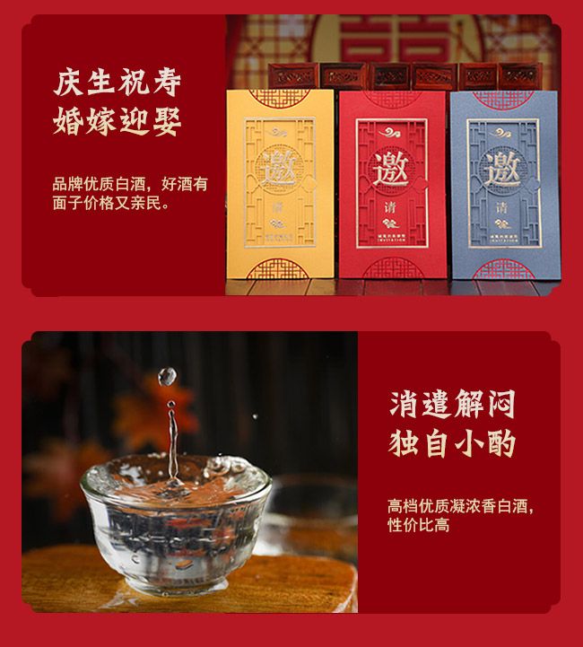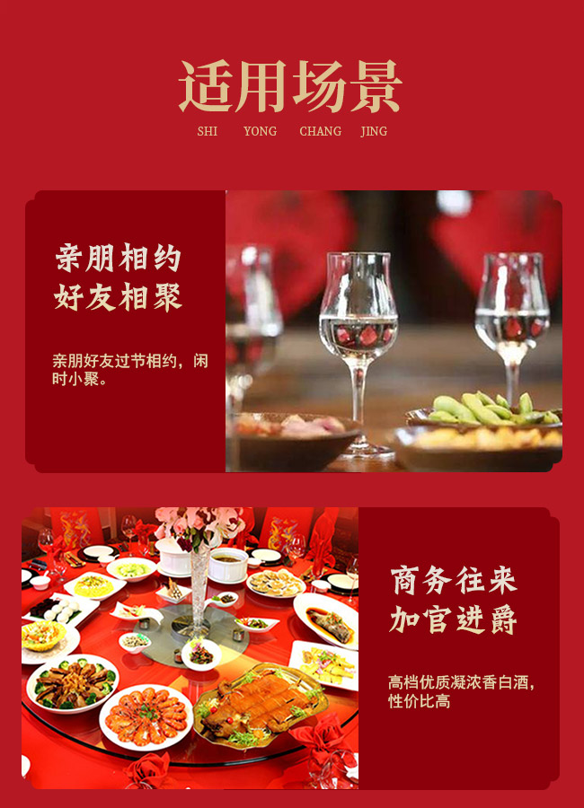 適飲場(chǎng)合:商務(wù)宴會(huì)、團(tuán)圓小酌、婚慶宴席、節(jié)日送禮、收藏等