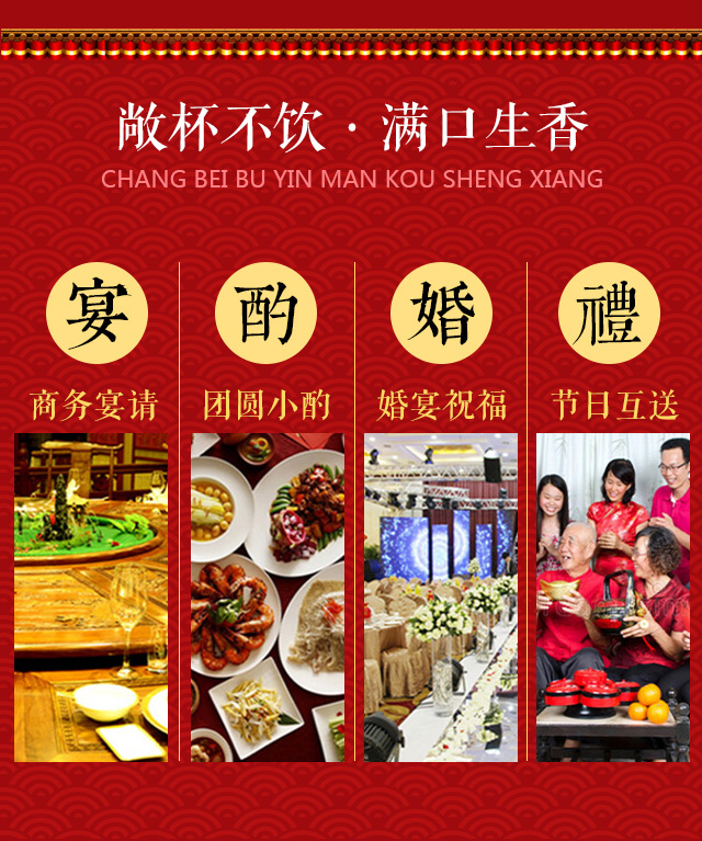 適飲場(chǎng)合:商務(wù)宴會(huì)、團(tuán)圓小酌、婚慶宴席、節(jié)日送禮、收藏