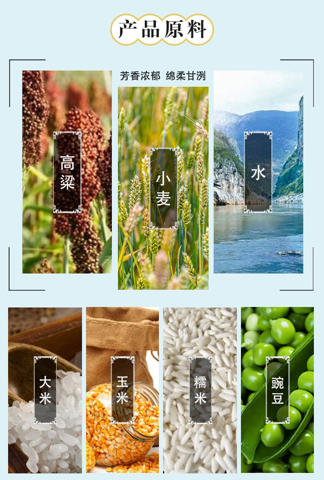 原料:水、高粱、大米、玉米、小麥、糯米、豌豆等
