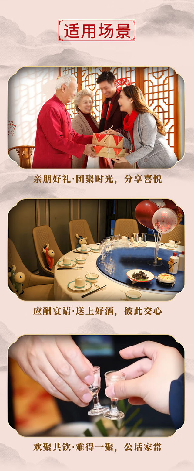 使用場景:商務(wù)接待、宴請、聚會、自飲、收藏,金紅搭配外觀寓意繁榮與喜慶