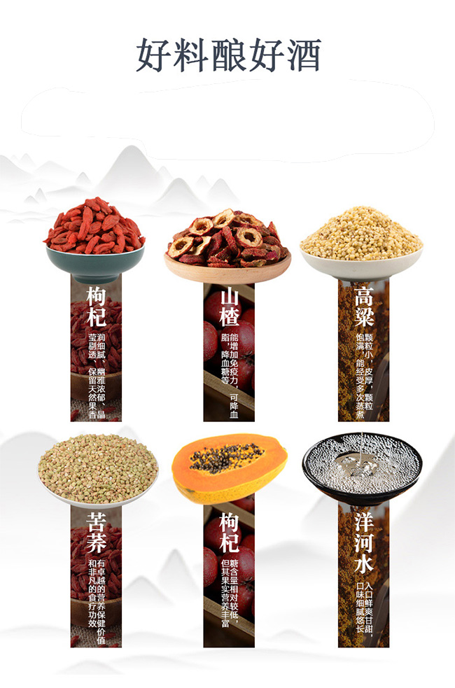多糧白酒風味物質(zhì)多樣,酯類等香氣物質(zhì)豐富,以高梁、黑蕎麥、特產(chǎn)枸杞、紅山楂。洋河水和木瓜為原料經(jīng)陳年老窖發(fā)酵調(diào)制而成。