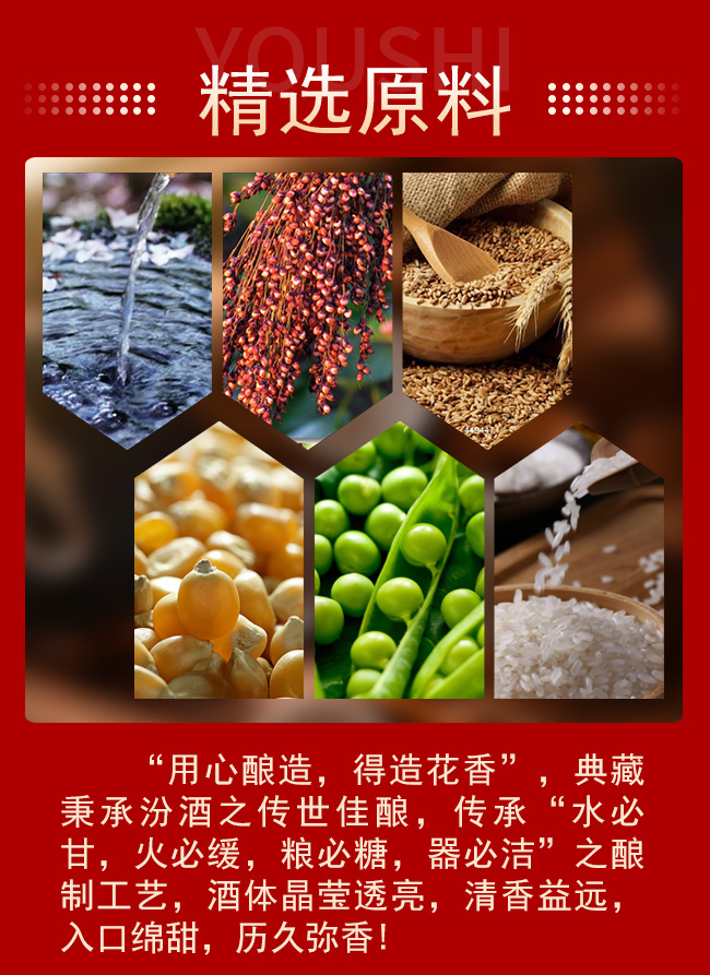 “用心釀造,得造花香”,典藏秉承汾酒之傳世佳釀,傳承“水必甘,火必緩,糧必糖,囂必潔”之釀制工藝,酒體晶瑩透亮,清香益遠(yuǎn),入口綿甜,久爾彌香。
