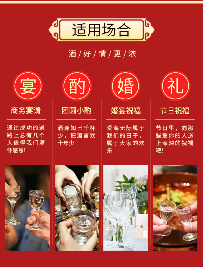 適飲場(chǎng)合:商務(wù)宴會(huì)、團(tuán)圓小酌、婚慶宴席、節(jié)日送禮、收藏等