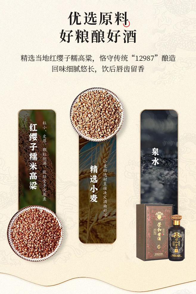 公司一貫高度重視質(zhì)量,堅(jiān)持走質(zhì)量效益型道路。由一大批長(zhǎng)期從事釀酒生產(chǎn)科研的專業(yè)技術(shù)人才嚴(yán)把質(zhì)量關(guān)。產(chǎn)品開發(fā)已形成系列,先后研制開發(fā)出了榮和醬酒系列、榮和經(jīng)典系列、榮和燒坊系列、百年榮和系列等酒。