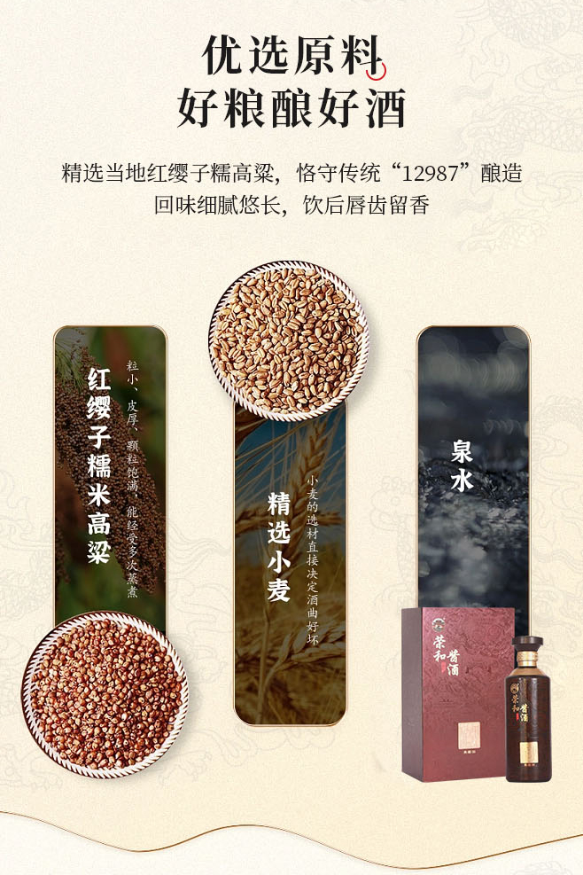 公司一貫高度重視質(zhì)量,堅(jiān)持走質(zhì)量效益型道路。由一大批長期從事釀酒生產(chǎn)科研的專業(yè)技術(shù)人才嚴(yán)把質(zhì)量關(guān)。產(chǎn)品開發(fā)已形成系列,先后研制開發(fā)出了榮和醬酒系列、榮和經(jīng)典系列、榮和燒坊系列、百年榮和系列等酒。