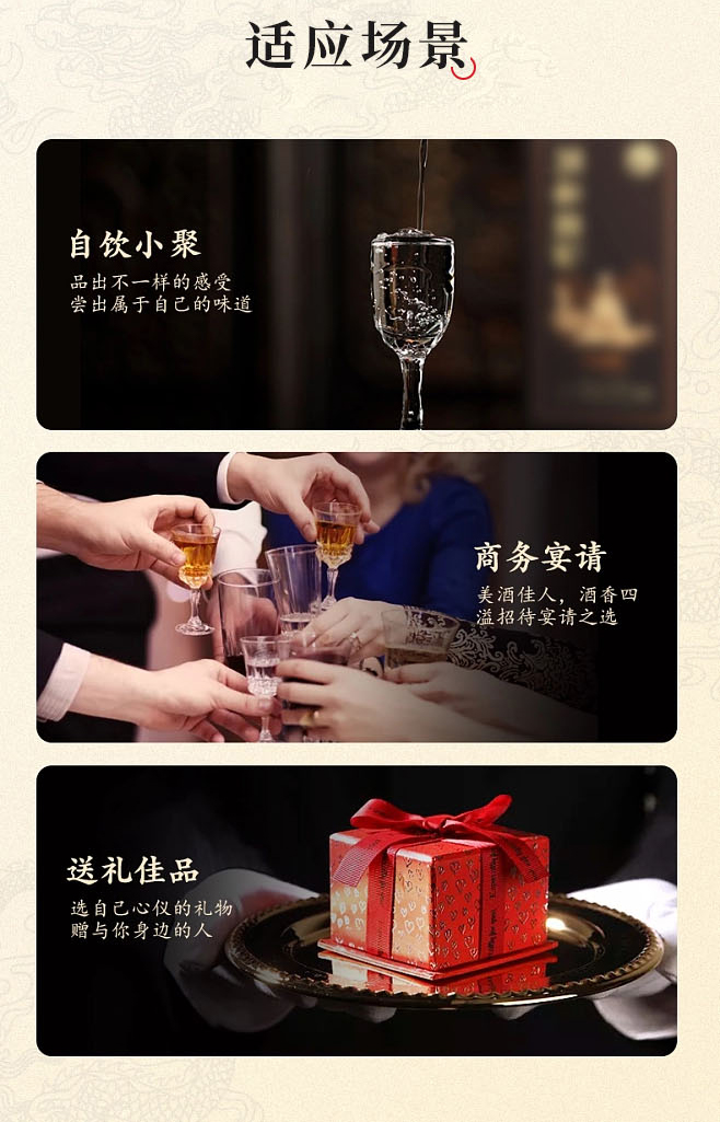適飲場合:商務(wù)宴會、團(tuán)圓小酌、婚慶宴席、節(jié)日送禮、收藏