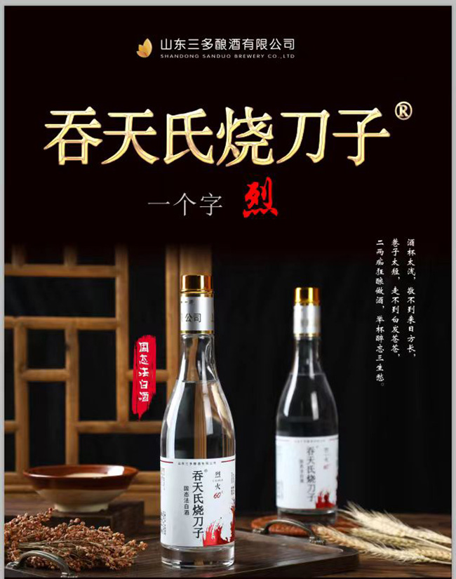 經(jīng)過初步策劃開發(fā),現(xiàn)主要有吞天氏燒刀子酒,薯實(shí)黑蒜酒,咕嘍咕嘍酒,地瓜燒酒、地瓜干酒等系列產(chǎn)品,2018年6月試運(yùn)營以來深受山東及周邊多省地區(qū)人民的喜愛,并得到各同行和客戶的信任和贊譽(yù)。經(jīng)典瓶形,簡單包裝,“甜、綿、軟、凈、香”的獨(dú)特風(fēng)格,爭取在當(dāng)今酒水品牌眾多的市場(chǎng)形勢(shì)下,闖出屬于我們的一片天空!