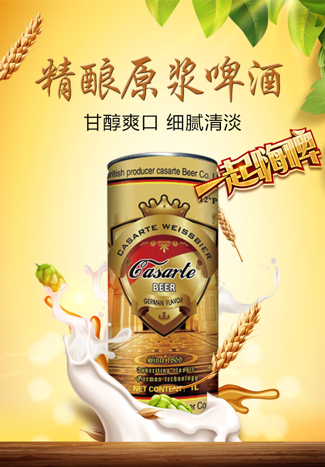 我公司精選優(yōu)級(jí)進(jìn)口麥芽、啤酒花、優(yōu)級(jí)大米、上等酵母,采用優(yōu)級(jí)純凈水,超低溫長(zhǎng)時(shí)間發(fā)酵,啤酒風(fēng)味保鮮技術(shù)密閉隔氧,全過(guò)程純凈化釀造,使酒液清澈透明,純凈自然,口味清爽,更加適合消費(fèi)者的消費(fèi)需求。合理的保持了啤酒的各種營(yíng)養(yǎng)成分,其色澤金黃透明,泡沫潔白細(xì)膩、掛杯持久、純爽柔和、麥香味濃郁。