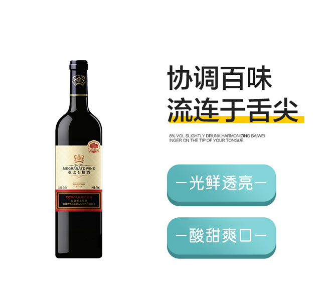 品鑒:本酒采用獨(dú)特發(fā)酵工藝精釀而成,石榴酒酒體純正,色澤光亮透明,酸甜爽口,保留了石榴酸、甜、澀、鮮之 天然風(fēng)味,其風(fēng)格獨(dú)特。
