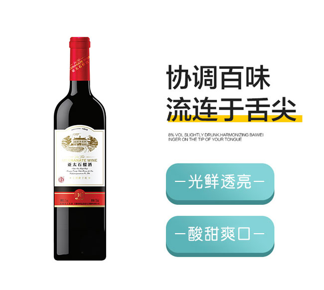 品鑒:本酒采用獨特發(fā)酵工藝精釀而成,石榴酒酒體純正,色澤光亮透明,酸甜爽口,保留了石榴酸、甜、澀、鮮之 天然風味,其風格獨特。