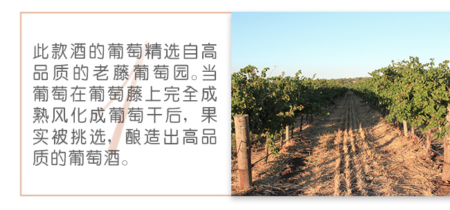 此款酒的葡萄精選自高品質(zhì)的老藤葡萄園。當(dāng)葡萄在葡萄藤上完全成熟風(fēng)化成葡萄干后,果實(shí)被挑選,釀造出高品質(zhì)的葡萄酒。