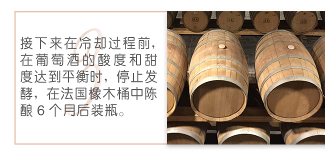 接下來在冷卻過程前,在葡萄酒的酸度和甜度達(dá)到平衡時(shí),停止發(fā)酵,在法國(guó)橡木桶中陳釀6個(gè)月后裝瓶。