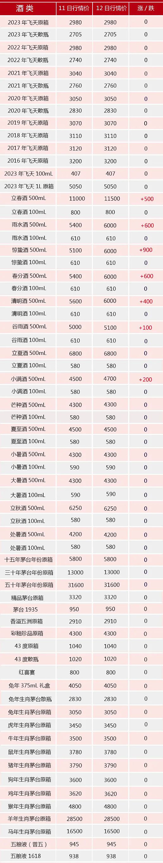 11月12日茅臺(tái)酒行情價(jià)。飛天和生肖方面無動(dòng)價(jià)。其他系列中,多款節(jié)氣酒漲100~900元/瓶。